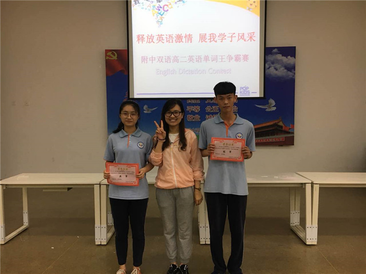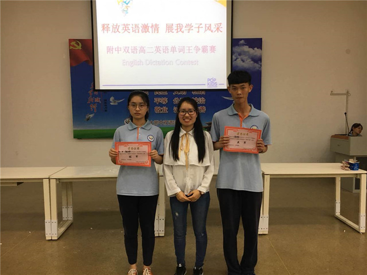 為了激發(fā)學(xué)生學(xué)習(xí)英語興趣,豐富詞匯量,提高學(xué)生英語綜合素質(zhì),給學(xué)生提供一個展示自我的平臺,高二年級開展了以“釋放英語激情,展我學(xué)子風(fēng)采”為主題的英語單詞王爭霸賽。本次大賽共分為激情團(tuán)隊賽、活力小組賽和魅力個人賽三個環(huán)節(jié)。