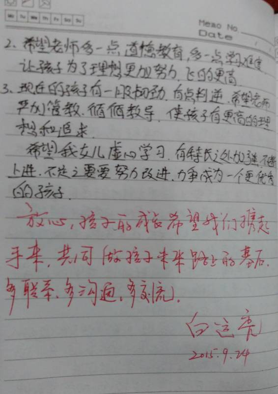 導(dǎo)師直接指導(dǎo)學(xué)生,根據(jù)不同學(xué)生的個性需求,采取個性化、親情化的教育方法。學(xué)生可以自主選擇導(dǎo)師,導(dǎo)師也可以直接選擇學(xué)生。德育導(dǎo)師的任務(wù)是:認(rèn)真傾聽學(xué)生的心聲,承認(rèn)學(xué)生的個性差異,尊重學(xué)生的身心發(fā)展特點和認(rèn)知水平,及時幫助學(xué)生解決成長中遇到的困難和困惑。教育日記作為學(xué)生,老師和家長之間溝通的載體。導(dǎo)師是學(xué)生思想上的指引者、學(xué)習(xí)上的輔導(dǎo)員、生活上的指導(dǎo)員、心理上的疏導(dǎo)者。導(dǎo)師根據(jù)不同學(xué)生的不同需求,因材施教,強(qiáng)化個別化指導(dǎo),以增強(qiáng)德育工作的針對性和實效性。對學(xué)生的選擇也有一定要求,應(yīng)盡量選拔學(xué)習(xí)成績優(yōu)異的學(xué)生試行,這樣容易出效果、出成績。