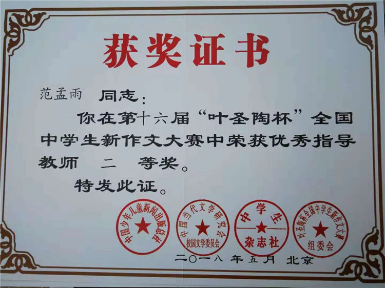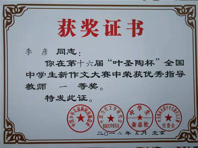 在第16葉圣陶杯比賽中,我校楊澍人同學(xué)斬獲一等獎(jiǎng),張科、張涵同學(xué)獲二等獎(jiǎng),李彥、范靈營(yíng)、舒明獲指導(dǎo)教師一等獎(jiǎng),高淑芳、范孟雨獲指導(dǎo)教師二等獎(jiǎng),郭文毅、劉晴、李奎、嚴(yán)潔獲指導(dǎo)教師三等獎(jiǎng)