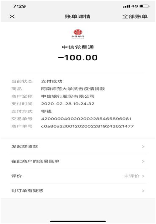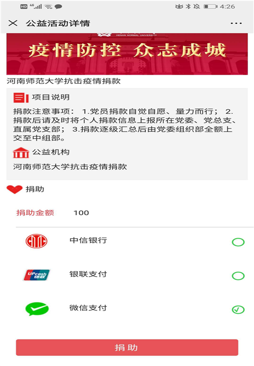 黨員們在短時間內(nèi)全部通過“黨費(fèi)通”平臺中的“萬眾一心抗擊疫情”欄目進(jìn)行了捐款,截至3月5日,全校共有5個黨支部81名黨員通過黨費(fèi)通平臺累計捐款7910元,所得善款將統(tǒng)一用于疫情防控工作。有些同志不僅在此次活動中積極捐款,早前還通過其他渠道捐款捐物,其中楊雨同志通過武漢市慈善總會專項慈善基金捐款100元,張倩茹同志為陜西某社區(qū)捐獻(xiàn)3M口罩120個。