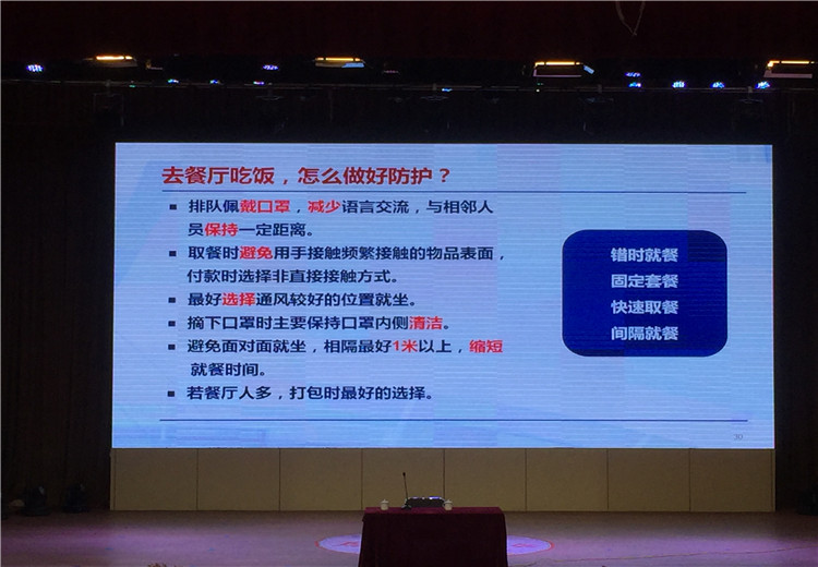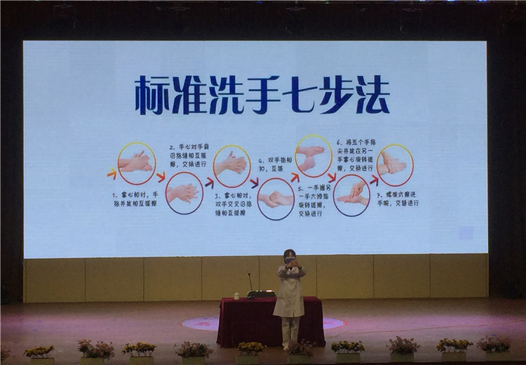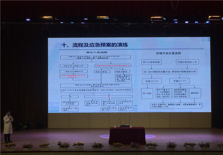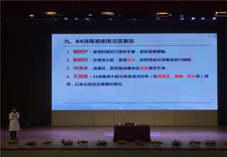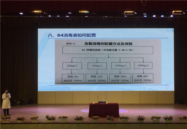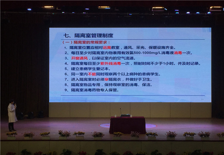 帥主任從新冠病毒相關知識、新冠病毒傳播途徑、如何做好個人防護、如何正確戴口罩、校園環(huán)境如何清潔消毒、隔離室的設置和管理制度、84消毒液如何配置及正確使用七個方面,向全體教職工進行了詳細講解,使大家對于學校疫情防控的全流程、各環(huán)節(jié)都有了科學明確的認知。講座過程中,帥主任根據(jù)自己豐富的知識儲備和經(jīng)驗積累,特別強調(diào)了一些細節(jié),如:氯已定不能有效滅活病毒;病毒對紫外線和熱敏感,56℃以上30分鐘即可被殺滅;地面和公共區(qū)域設施用有效氯250~500mg/L含氯消毒劑擦拭,隔離室、垃圾桶等需用有效氯500~1000mg/L消毒液消毒;門把手、鍵盤、鼠標等金屬物品表面不能用84等含氯消毒液,需用用75%的酒精清潔消毒;同一隔離室內(nèi)不能同時觀察兩個以上病種的患病學生等。
