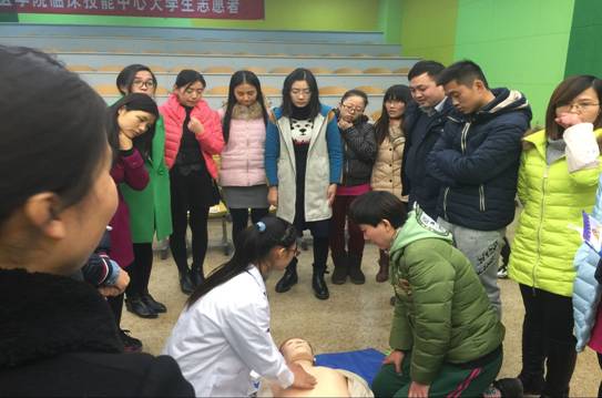 然后,新鄉(xiāng)醫(yī)學(xué)院臨床技能中心的志愿者們對(duì)全體教師和高一的同學(xué)們進(jìn)行了應(yīng)急救治實(shí)踐模擬演練,老師同學(xué)們都積極參與,熱情詢問,主動(dòng)模擬演練。