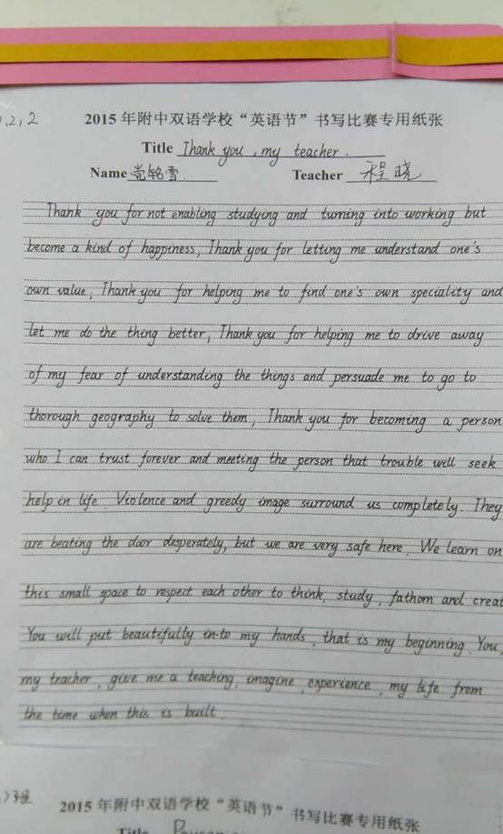 為了豐富校園文化生活,營造學(xué)習(xí)英語氛圍,提高學(xué)生綜合素質(zhì),讓學(xué)生學(xué)好英語、用好英語。河南師大附中雙語國際學(xué)校首屆英語節(jié)于12月1日盛大開幕,全校師生共同精心設(shè)計出系列英語活動主題。12月1日至12月7日舉行了中學(xué)部英語書法大賽。每名學(xué)生都積極參與,彰顯書法風(fēng)采。層層篩選之后,全體英語組教師共選出雙語國際學(xué)校首屆英語節(jié)書法大賽特等、一、二、三等獎。