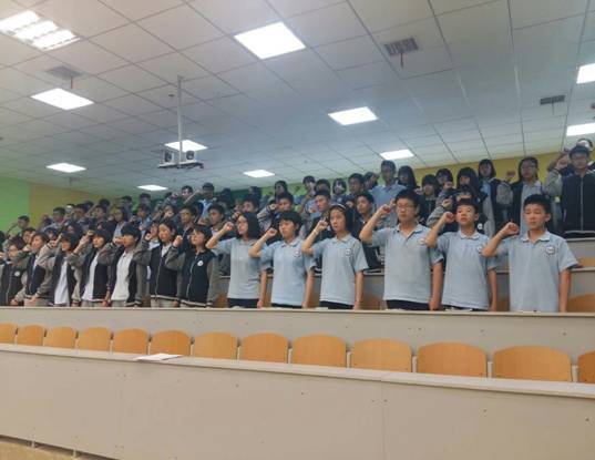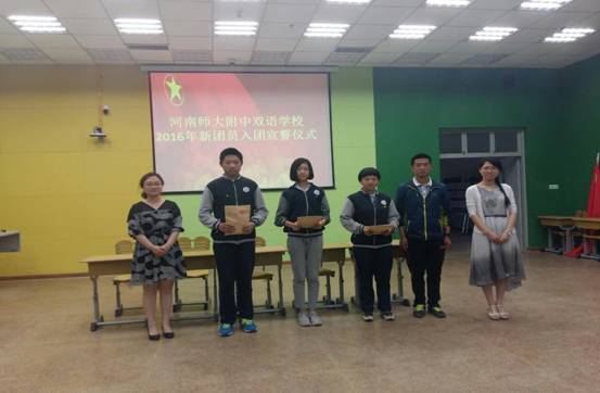“我們是五月的花海,用青春擁抱時代。我們是初升的太陽,用生命點燃未來……”歌聲雄壯、激越歡快,2016年6月1日下午,河南師大附中雙語學校隆重舉行了新團員入團宣誓儀式。