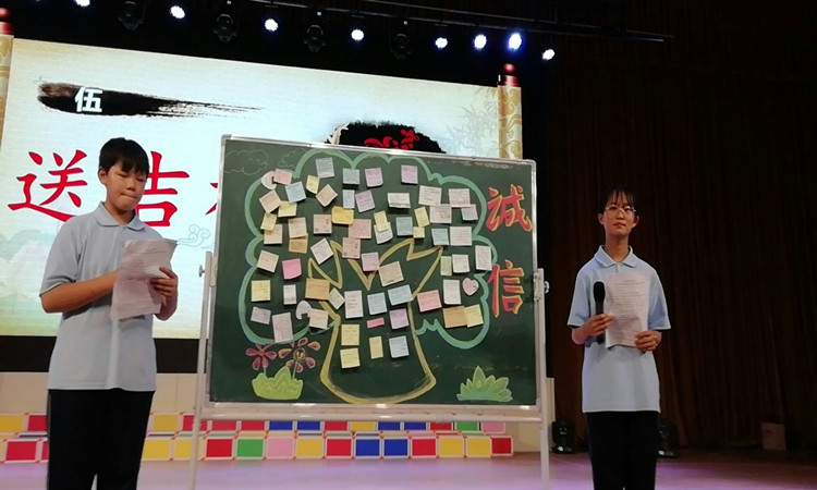 在“誦經(jīng)典”環(huán)節(jié)中,初一全體學(xué)生以班級為單位,分為五個小組,分別誦讀關(guān)于“誠信”的名言警句。洪亮的聲音響徹整個劇場,氣氛熱烈而莊重,廣大師生深受感染。